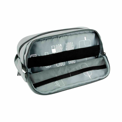 Organizador para accesorios de tecnología con dos compartimentos. Cuenta con divisiones para guardar memoria Micro SD, USB, cables, cargadores, cámara, mouse, etc.