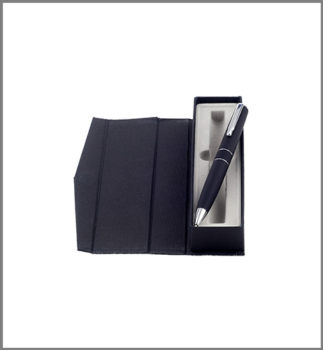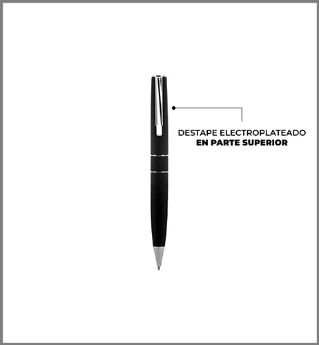 Metal. Cuerpo metálico engomado. Clip y detalles color plata. Estuche con cierre magnético. Área de impresión: Ø 0-8 x 5 cm. Destape electroplateado en la parte superior.