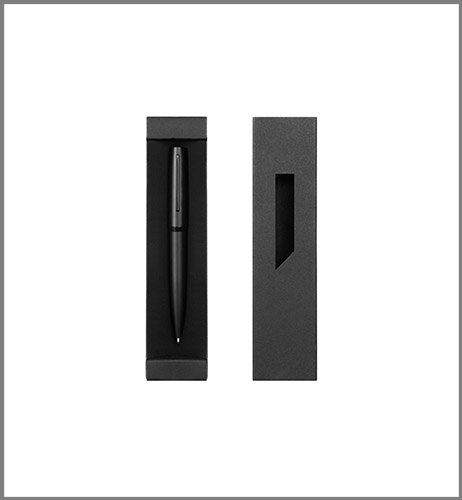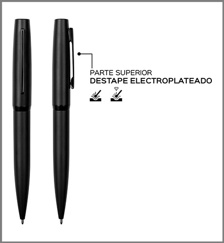 Metálico. Cuerpo color mate. Clip y arandela metálico. Apertura giratoria. En la parte superior destape plateado. Estuche de cartón de 18 x 4 x 2 cm.