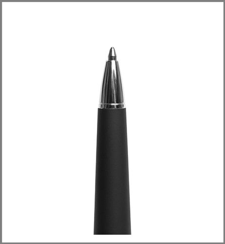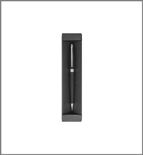 Metálico. Cuerpo color negro engomado. Clip- puntera y detalles en color plata. Apertura giratoria. Con estuche de cartón. Destape electroplateado en la parte superior.