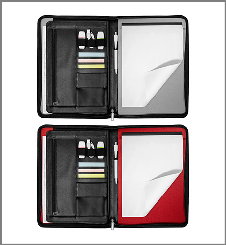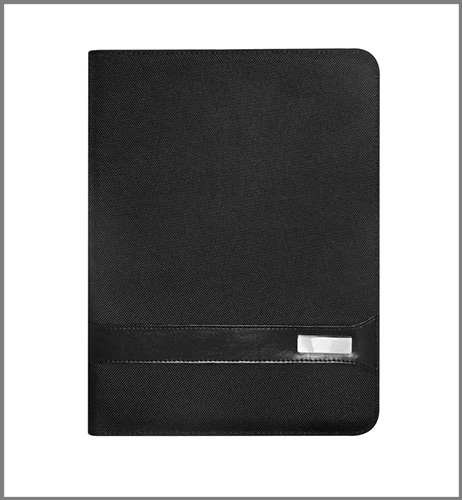 34 x 25 cm. Exterior de Nylon- Microfibra y detalles en símil cuero y metal. Interior: compartimento- bolsillo con cierre- tarjetero- porta bolígrafos elástico y hojas A4 lisas.