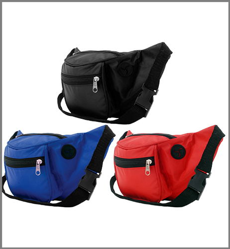 Polyester 420D. 33 x 14-5 cm.2 bolsillos.Salida para audífonos.Correa ajustable.Herrajes Plásticos Área de Impresión: 10 x 6 cm