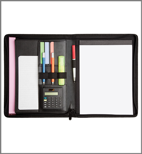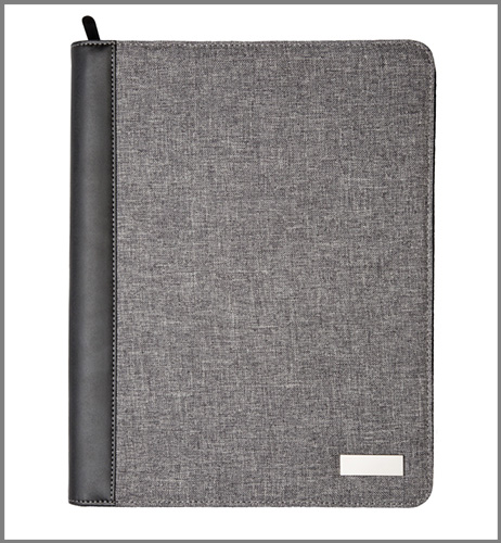 33-5 x 25 cm. (cerrado). 53 x 25 cm. (abierto). Símil Cuero y Lino 150D. Carpeta con cierre. Tapa acolchada. Placa metálica para impresión (medida: 5 x 2 cm). Interior: organizador porta tablet- porta tarjetas- calculadora- porta bolígrafos elástico y 3 sujetadores elásticos.