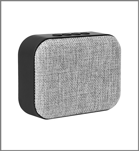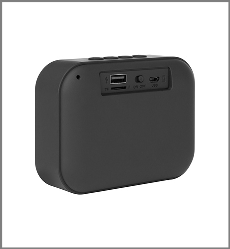 11 x 8 x 4 cm. Plástico engomado y tela. Parlante bluetooth. En la parte superior tiene botones de Modo- volumen y Play. Con el botón Modo se elige entre las opciones de Bluetooth y USB. Opción de responder llamadas desde el parlante pulsando una vez el botón Play cuando entra la llamada. En la base detalles antideslizantes. Alcance de transmisión hasta 10 mts. Voltaje DC 5V. Incluye cable USB para carga.