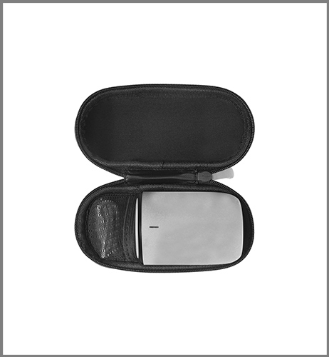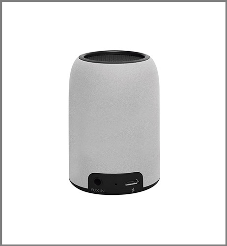 Ø 4-5 x 7 cm. (aprox). Plástico engomado. Mini parlante. En la base: goma antideslizante- interruptor de encendido y apagado- botón de reproducción/pausa- respuesta y finalización de llamada. Luz led que indica carga- conexión a bluetooth y escuchar música. Micrófono que permite realizar llamadas. En uno de sus costados entrada para audífonos/auriculares y puerto USB para su carga. Estuche con cierre en su interior un pequeño bolsillo de malla. Incluye cable de carga USB y de audio.