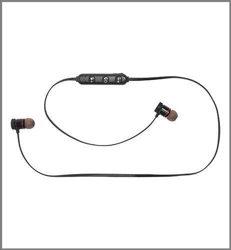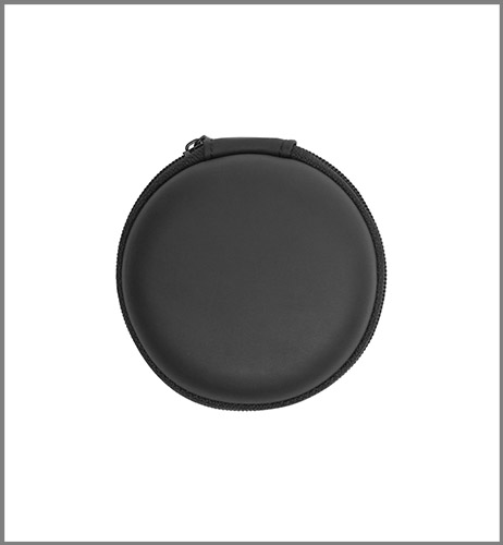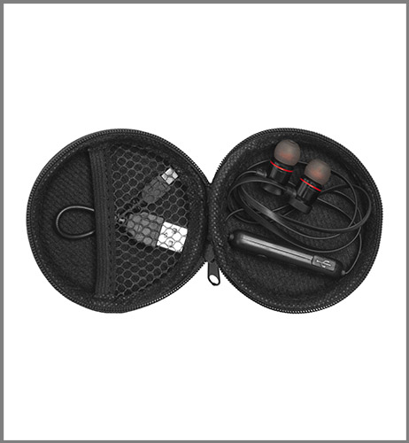 Plástico. Audífonos bluetooth. Cable de 70 cm aprox. Botones para aumentar / disminuir el volumen- aceptar y rechazar una llamada. Los audifonos son imantados. En uno de los costados entrada mini usb para recargar la batería. Estuche redondo de Eva Pouch. Incluye repuestos para los audífonos.
