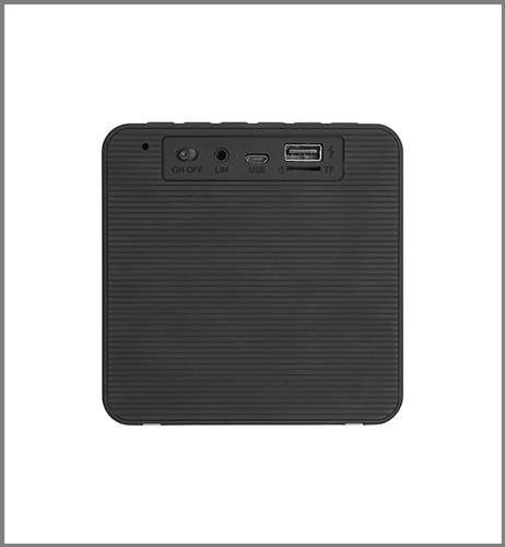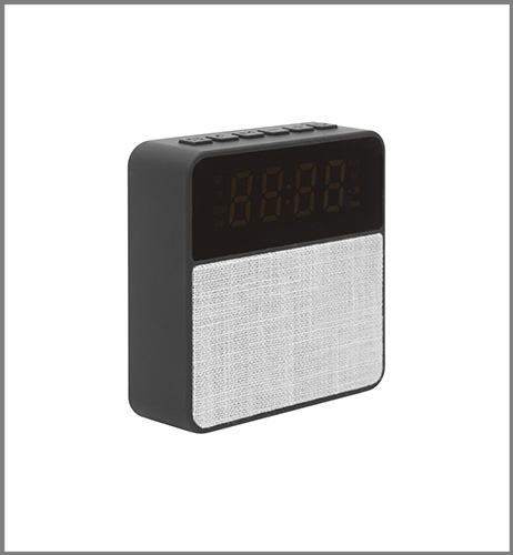 10-5 x 10-6 x 3-6 cm. Parlante Speaker- reloj y radio. Plástico con tela. En la parte superior botones de: reloj que permite configurar la hora- botón para atender llamadas- botón de modo que permite seleccionar bluetooth- con radio FM- tarjeta TF y entrada auxiliar- botón de volumen (+) y (-) y botón de play/pausa. Pantalla con luz led blanca que visualiza la hora- modo seleccionado y estado de bateria. En la parte de atrás perilla on/off- entrada plug- 2 USB y TF. En la parte inferior dos gomas antideslizantes. Alcance 10 metros. Cuenta con manual para facilitar la configuración.