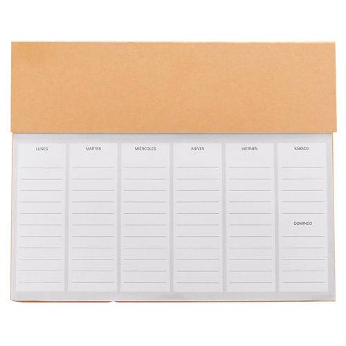 Programador semanal con 100 hojas. Incluye bolígrafo ecológico, clips y banderillas adheribles de 6 colores.