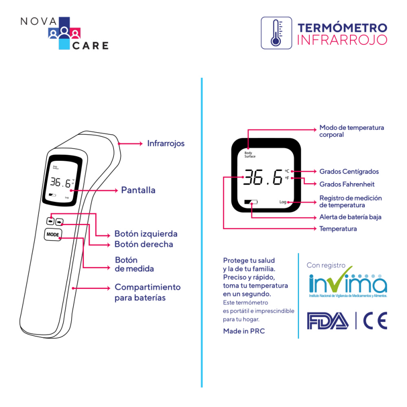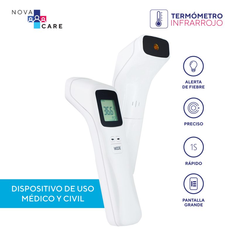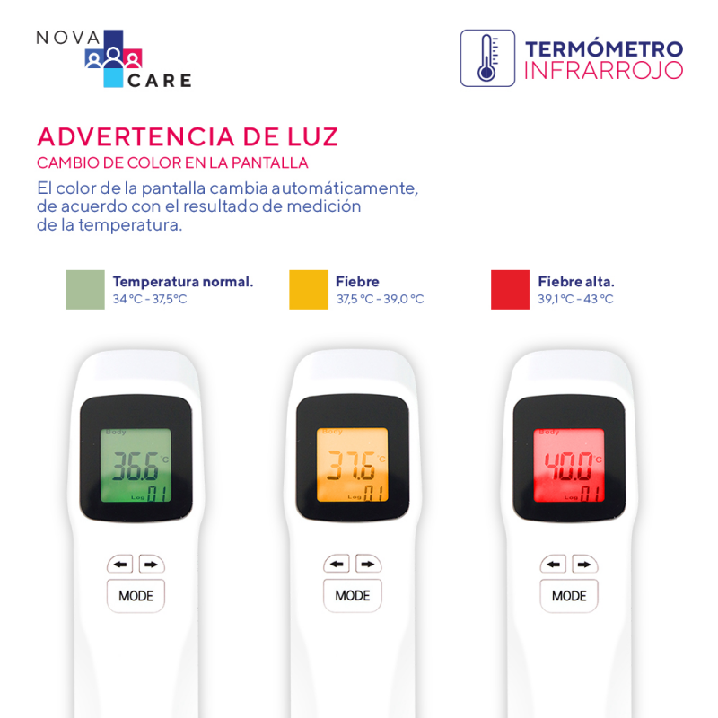 Dispositivo de fácil operación sin ningún contacto la pantalla cambia de color de acuerdo a temperatura puede ser utilizado para medición de temperatura corporal como para superficies. DISPOSITIVO PARA USO MEDICO Y CIVIL CON AVAL DE LAS AUTORIDADES SANITARIAS.