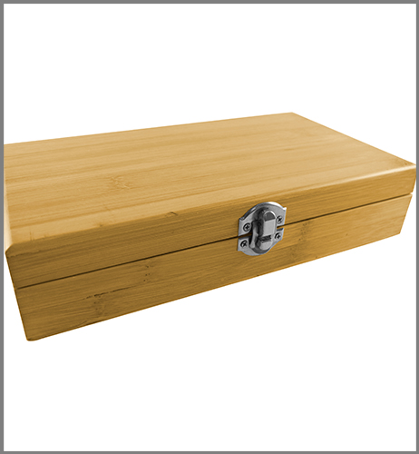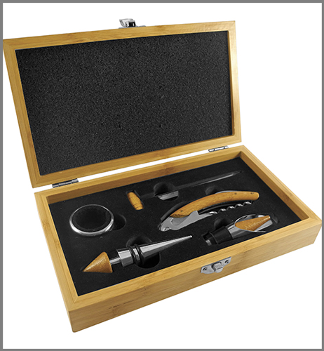 23 x 13 x 5 cm. Caja de madera en Bamboo color natural- cierre metálico con set de 5 piezas de bar: Sacacorchos- Tapón Cortagota- Termometro y Vertedor.