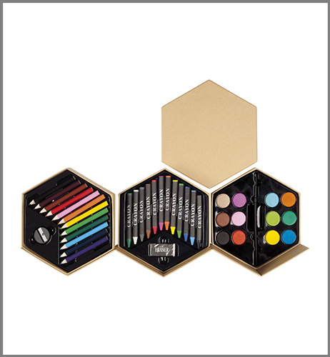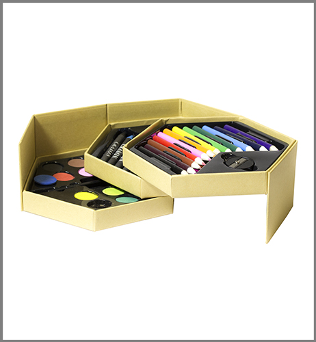 16 x 8 cm. (cerrado) 44 x 8 cm. (abierto). Cartón. Set de pinturas en forma de hexágono. 12 lapices de colores- 1 sacapuntas- 12 crayones- 1 goma de borrar- 12 acuarelas y 1 pincel.