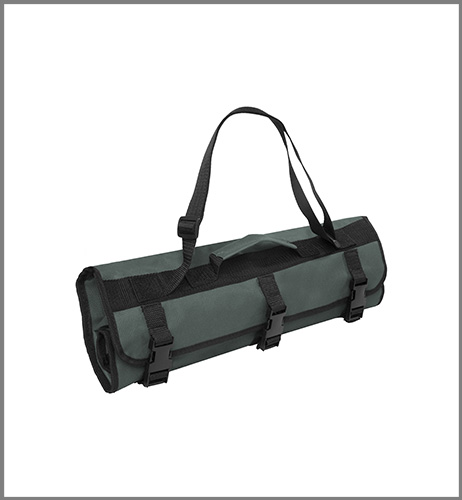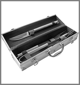 Ø 9 x 46 cm. (cerrado) 60 x 46 cm. (abierto). Polyester y acero inoxidable. Set para asador cuenta con tenedor asador- cuchilla de acero inoxidable- cepillo de aluminio- espátula- pinza- pincel- 4 pinchos para brochetas y 6 pinchos pequeños. Estuche de polyester con manija y tres hebillas plásticas para cerrar.