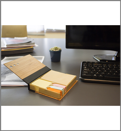 12 x 10-5 x 2 cm. Bambú. Contiene un block adhesivo rectangular de papel reciclado- un block adhesivo pequeño de color y 3 blocks en forma de flecha. El exterior del estuche es de bambú con detalles de tela- el interior es de plástico con divisiones.