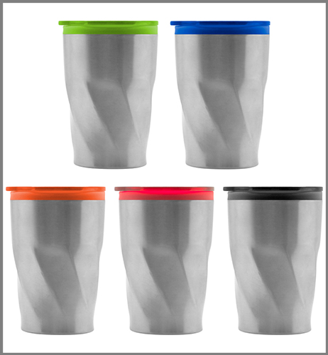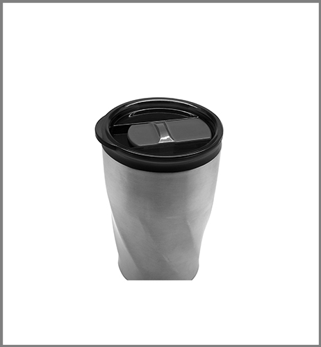Ø 8-3 x 12-5 cm. Acero inoxidable y plástico. Capacidad 380 ml. Interior plástico y exterior metalico con detalles. Tapa de color con ajuste- la cual asegura que el líquido no se derrame. Con base de goma antideslizante.