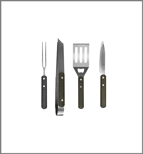 36-5 x 11 x 5-2 cm. (medidas del estuche). 28-9 cm (medida del tenedor parrillero) 33 cm (medida de la pinza). 28 cm (medida de la espatula). 29 cm. (medida del cuchillo con protección plástica). Madera y acero inoxidable. Estuche con manijas que contiene accesorios para la parrilla: tenedor parrillero-Pinza para servir-cuchillo y espatula.