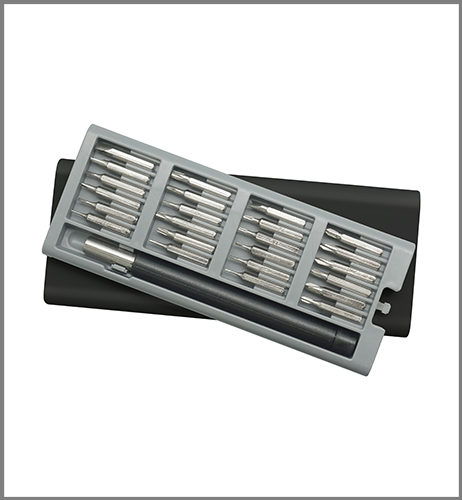16-5 x 6-8 x 1-8 cm. Plástico y Acero. Mango con punta imantada con 24 puntas diferentes. La caja viene con cuatro compartimentos imantado que permite mantener ordenadas las diferentes puntas. La caja contiene apertura push.